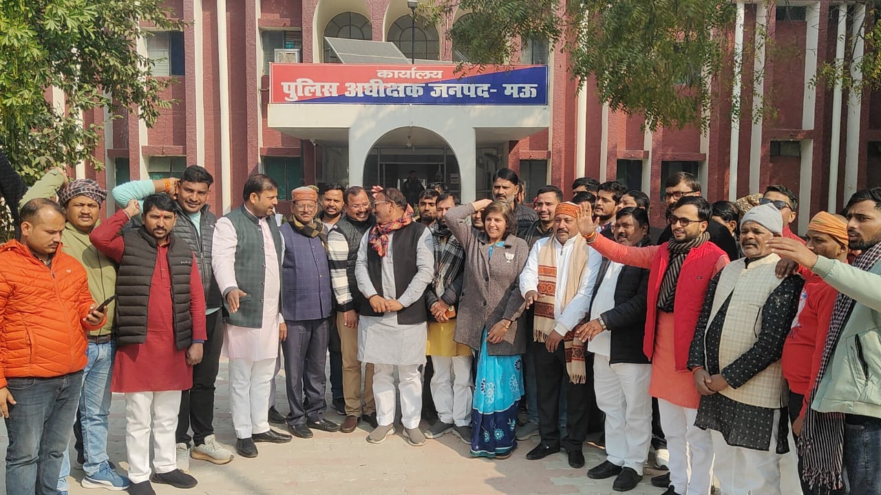 Mau : उत्तर प्रदेश सरकार के ऊर्जा मंत्री एके शर्मा के खिलाफ सोशल मीडिया पर की जा रही आपत्तिजनक टिप्पणियों के विरोध में शनिवार काे भारतीय जनता पार्टी (भाजपा) कार्यकर्ता पुलिस अधीक्षक कार्यालय पहुंचे और प्रदर्शन किया। कार्यकर्ताओं ने इस संबंध में ज्ञापन साैंपते