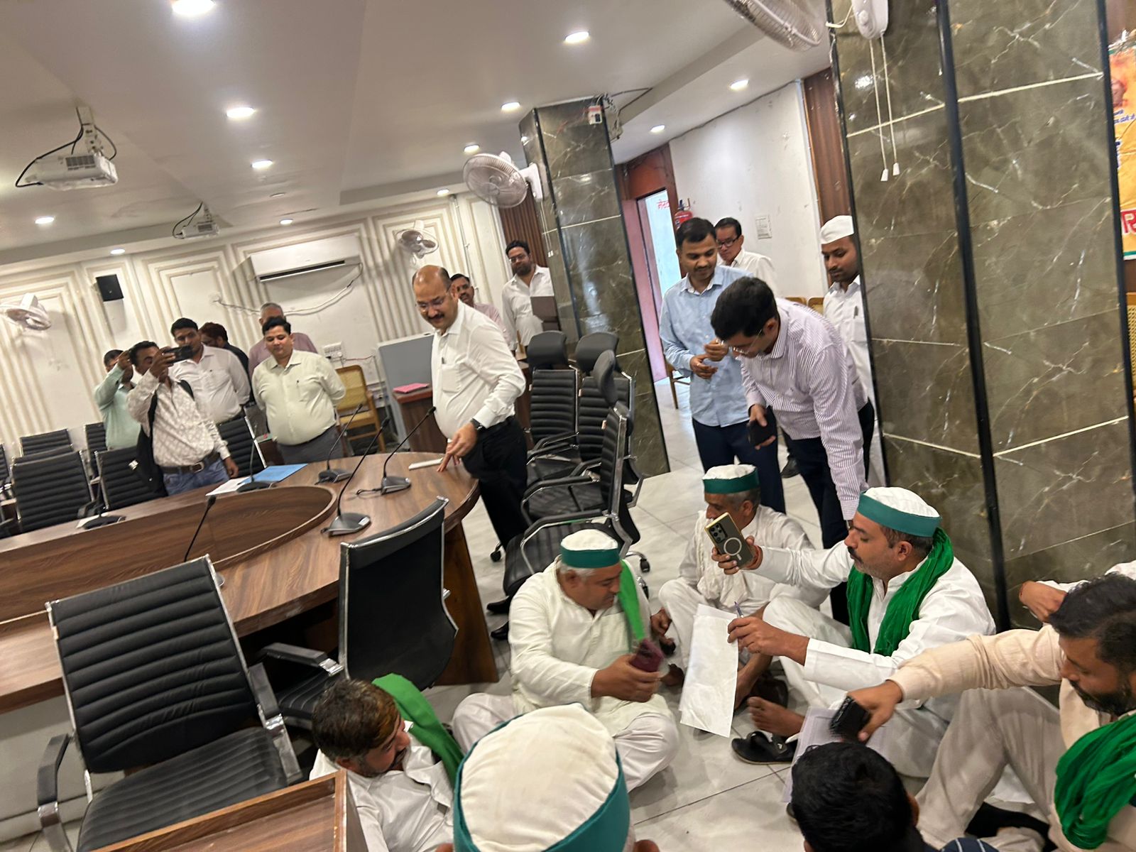 भाकियू जिलाध्यक्ष अनुराग चौधरी एवं किसान नाराज होकर विकास भवन में ही जमीन पर बैठ गए, उनके साथ अन्य किसान भी जमीन पर ही बैठ गए। इसके बाद जिलाधिकारी डॉ. वीके सिंह विकास भवन पहुंचे। उन्होंने सभी अधिकारियों के साथ मिलकर जिलाध्यक्ष अनुराग चौधरी को कुर्सियों पर बैठाया और समस्याओं के समाधान हेतु चर्चा करने का आग्रह किया। इस पर अनुराग चौधरी ने गन्ना भुगतान और रजवाहे समय पर चलवाने का मामला उठाया।