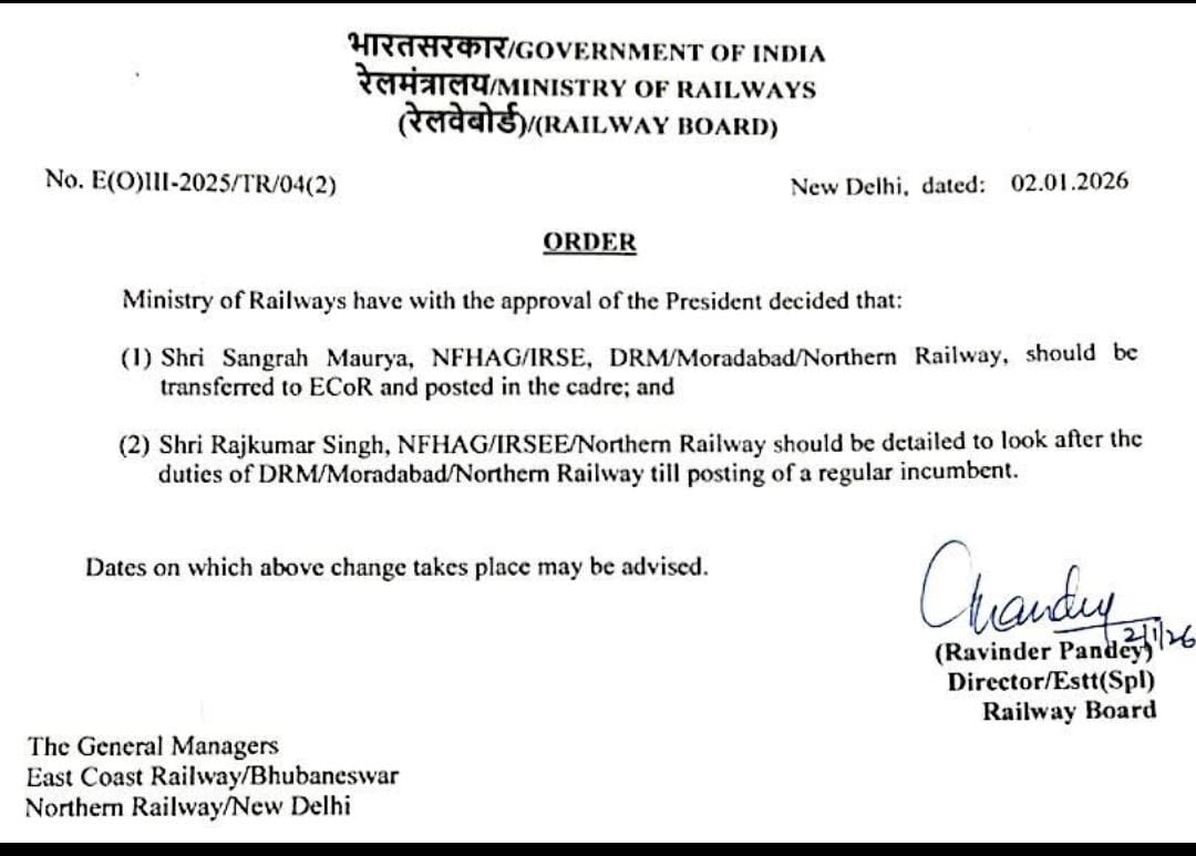 यह आदेश 2 जनवरी 2026 को नई दिल्ली से जारी किया गया। आदेश सामने आते ही मुरादाबाद रेलवे मंडल में अफसरों के बीच तेज हलचल शुरू हो गई। सूत्रों के अनुसार, आने वाले दिनों में मंडल स्तर पर कड़े फैसले, प्रशासनिक सख्ती और बड़े फेरबदल देखने को मिल सकते हैं।