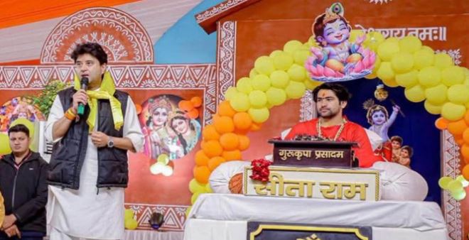 शिवपुरी : शिवपुरी जिला मुख्यालय पर आयोजित श्रीमद् भागवत कथा में बागेश्वर धाम के पीठाधीश्वर पंडित धीरेंद्र कृष्ण शास्त्री का वाचन लगातार जारी है। इसी दौरान कथा में दर्शन के लिए पहुंचे केंद्रीय संचार मंत्री ज्योतिरादित्य सिंधिया का शास्त्रीजी ने स्वागत किया।