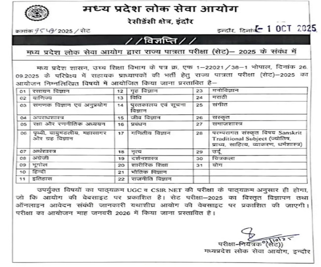 मध्य प्रदेश। मध्य प्रदेश राज्य पात्रता परीक्षा (MP SET 2025) की तैयारी कर रहे अभ्यर्थियों के लिए बड़ी अपडेट सामने आई है। मध्य प्रदेश लोक सेवा आयोग (MPPSC) ने परीक्षा से संबंधित आधिकारिक अधिसूचना जारी कर दी है। इसके अनुसार, यह परीक्षा कुल 31 विषयों में आयोजित की जाएगी और इसका आयोजन UGC NET व CSIR NET सिलेबस के आधार पर किया जाएगा।