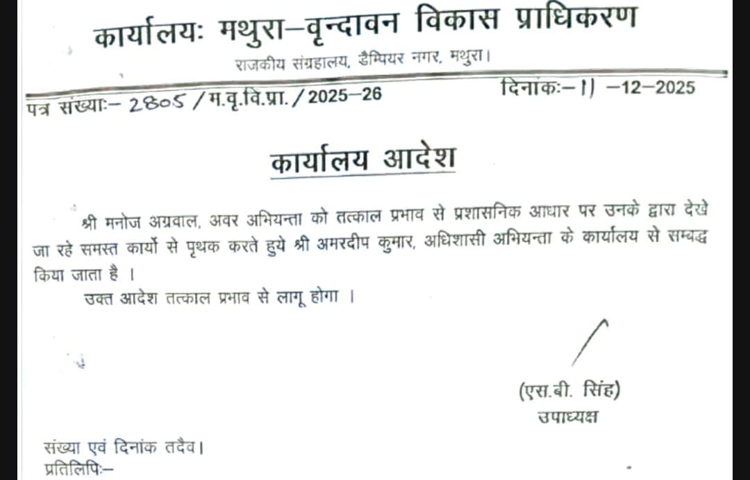 Vrindavan, Mathura : अवैध होटल निर्माण और घूसखोरी के मामले में मथुरा–वृंदावन विकास प्राधिकरण (एमवीडीए) ने कड़ा कदम उठाया है। प्राधिकरण के जूनियर इंजीनियर मनोज कुमार अग्रवाल को उनके मौजूदा पद से हटा दिया गया है। वहीं, उनके लिए दलाली करने वाला यतीश अग्रवाल फिलहाल जेल में है।
