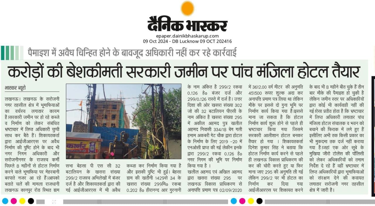 लखनऊ कानपुर रोड स्थित बेहसा गांव में सरकारी जमीन पर पांच मंजिला इमारत निर्माण होगा शिकायत के बाद जागा प्रशासन जॉच की प्रकिया जागा प्रशासन और जांच शुरू हुई गई बार राजस्व तहसील व नगर निगम की टीम पैमाईश की और जो निर्माण हुआ वह सरकारी खसरा संख्या 299/2 जो कि राजस्व अभिलेखों में ऊसर/बंजर दर्ज हैं । बेहसा स्थित 32 वीं वाहिनी पीएसी के पास निजी जमीन पर एनओसी लेकर सरकारी भूमि पर होटल निर्माण कर दिया शिकायतकर्ता दिनेश कुमार सिंह चौहान की शिकायत पर जांच शुरू हुई जनवरी माह में आईजीआरएस द्वारा शिकायत की थी जिस पर एंटी भू माफिया टास्क फोर्स के तहत नगर निगम व तहसील राजस्व की टीम संयुक्त पैमाइश कर कार्रवाई करने के निर्देश दिए गए मामला भ्रष्टाचार से जुड़ा है लेकिन अभी तक कोई मुकदमा तक दर्ज नहीं कराया गया है और ना ही जमीनी स्तर पर कोई भी कार्यवाही की गई है सरोजनी नगर तहसीलदार ने नगर निगम को पत्र द्वारा इलेक्ट्रानिक उपकरण से माप कराने की सलाह दी थी उसके बाद इलेक्ट्रॉनिक उपकरणों से मौके की माप आदि की गई लेकिन एक वर्ष से ज्यादा होने को है जमीनी स्तर पर किसी भी प्रकार की कार्यवाही नहीं ऐसे में सरकारी भूमि कब सुरक्षित होगी या इस भूमि को भूमाफियाओं को संबंधित अधिकारी सौदा कर बेचने का कार्य करेंगे कई सवाल हैं?