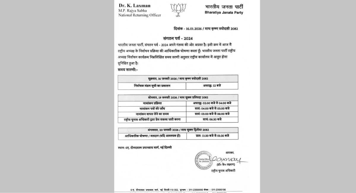 नई दिल्ली। भारतीय जनता पार्टी के कार्यवाहक अध्यक्ष नितिन नबीन सर्वसम्मति से अध्यक्ष चुने जाएंगे? फिलहाल राष्ट्रीय अध्यक्ष के चुनाव के लिए अधिसूचना जारी कर दी गई है। रिटर्निंग ऑफिसर डॉ. के लक्ष्मण ने पूरा चुनाव कार्यक्रम जारी किया है।