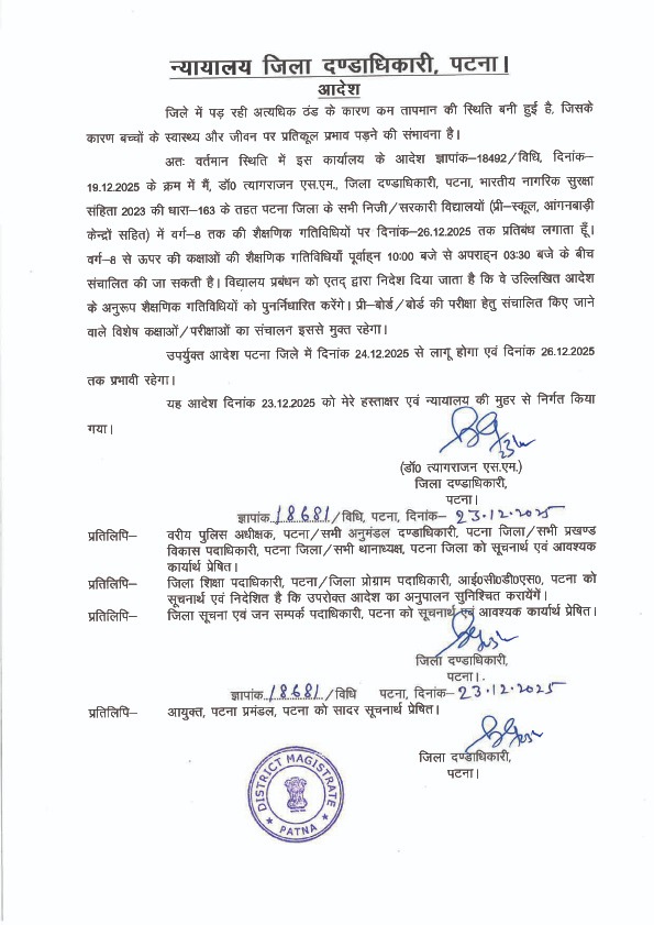 जिलाधिकारी ने कहा है कि 26 दिसंबर के बाद मौसम की स्थिति की समीक्षा की जाएगी और उसके आधार पर आगे की रणनीति तय की जाएगी। पिछले कुछ दिनों से पटना सहित पूरे बिहार में कड़ाके की ठंड पड़ रही है, जिससे सुबह के समय बच्चों को खासा परेशानी हो रही थी। अभिभावकों की ओर से भी स्कूल बंद करने की मांग लंबे समय से की जा रही थी, जिसे अब प्रशासन ने गंभीरता से लिया है।