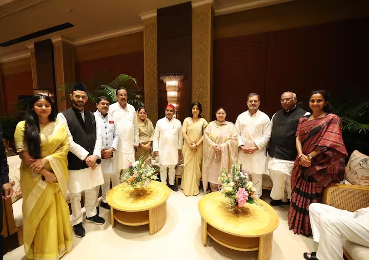 संसद के पूरे मानसून सत्र के दौरान बिहार SIR के मुद्दे और चुनाव आयोग पर लगे आरोपों को लेकर लगातार विरोध कर रहे विपक्ष के सभी सांसद सोमवार (11 अगस्त, 2025) को कांग्रेस अध्यक्ष मल्लिकार्जुन खरगे की तरफ से दी गई डिनर पार्टी में शामिल हुए।