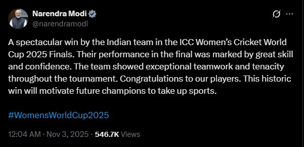 प्रधानमंत्री नरेन्द्र मोदी ने सोशल मीडिया प्लेटफॉर्म ‘एक्स’ पर पोस्ट करते हुए लिखा, “आईसीसी महिला क्रिकेट विश्व कप 2025 के फाइनल में भारतीय टीम की शानदार जीत! फाइनल में उनका प्रदर्शन अद्भुत कौशल और आत्मविश्वास से भरा रहा। टीम ने पूरे टूर्नामेंट में असाधारण टीम वर्क और दृढ़ता दिखाई। हमारी खिलाड़ियों को हार्दिक बधाई। यह ऐतिहासिक जीत भविष्य की चैंपियन खिलाड़ियों को खेलों में भाग लेने के लिए प्रेरित करेगी।”