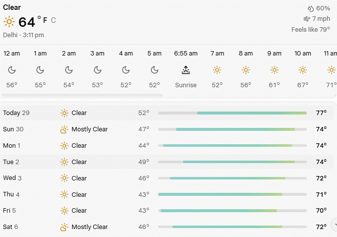 मौसम का साथ: अगले कुछ दिनों में क्लियर स्काई, तापमान 70-77°F (21-25°C) के आसपास, लेकिन ठंड बढ़ने से प्रदूषण जमा होता रहेगा।