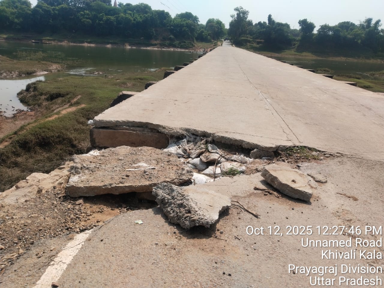 Koraon Prayagraj : कोराव तहसील क्षेत्र के भोगन गांव के पास बेलन नदी पर बना रपटा पुल बारिश के दौरान टूट जाने से राहगीरों की जान पर खतरा मंडरा रहा है। यह वही पुल है जिसे लोक निर्माण विभाग (PWD) ने लाखों रुपये खर्च कर एक ठेकेदार के माध्यम से बनवाया था, लेकिन पहली ही भारी बारिश में पुल का अधिकांश हिस्सा बह गया।