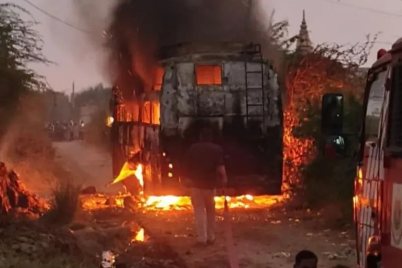 मिली जानकारी के मुताबिक, समोना गांव के पास बस जैसे ही रास्ते में पहुंची, तभी ऊपर से गुजर रहे बिजली के तारों के संपर्क में आ गई, जिससे बस में अचानक आग भड़क उठी। आग इतनी तेज थी कि देखते ही देखते उसने पूरे बस को अपनी चपेट में ले लिया। इस भयंकर आग के कारण आसपास के ग्रामीण भी दहशत में आ गए और इधर-उधर भागने लगे।