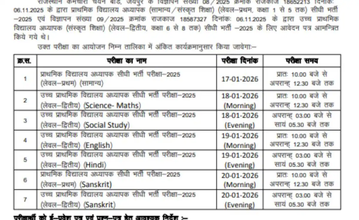 REET मेन्स परीक्षा लेवल-I (कक्षा 1-5) और लेवल-II (कक्षा 6-8) के लिए आयोजित की जा रही है। इस भर्ती प्रक्रिया के तहत कुल 7,759 पद भरे जाएंगे। परीक्षा 17 जनवरी से 20 जनवरी तक आयोजित होगी। परीक्षा वाले दिन एडमिट कार्ड के साथ पहचान पत्र भी साथ लाना जरूरी है, जिसमें आपकी फोटो होनी चाहिए। उम्मीदवार को एग्जाम सेंटर पर कम से कम 2 घंटे पहले पहुंचना होगा।