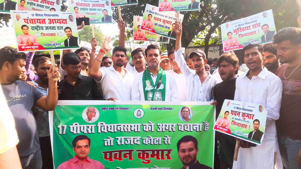 मौके पर मौजूद पूर्वी चंपारण जिले के पिपरा विधानसभा (संख्या 17) से दावेदारी कर रहे पवन कुमार अपने समर्थकों के साथ पहुंचे थे। पवन वर्तमान में चकिया नगर परिषद के सभापति हैं और राजद से टिकट की उम्मीद लगाए हुए हैं। समर्थक उनकी उम्मीदवारी के समर्थन में सिंबल देने की मांग कर रहे हैं।