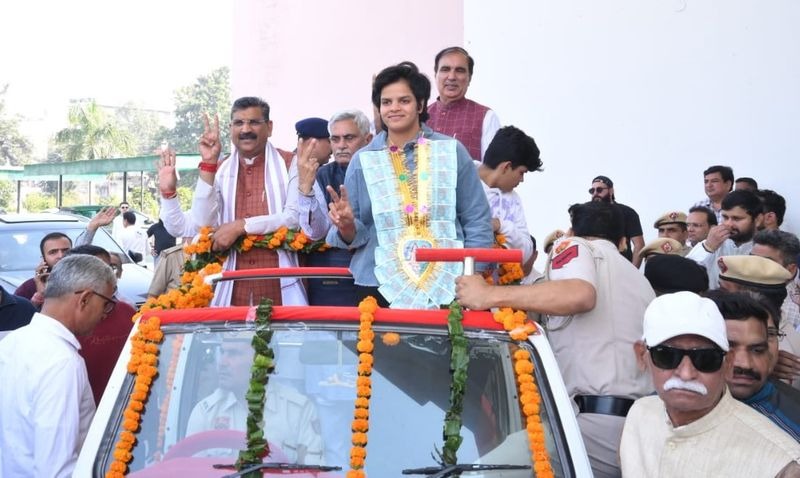 रोहतक के सर्किट हाउस में मंत्री कृष्ण कुमार बेदी और अन्य भाजपा नेता शेफाली वर्मा को पगड़ी पहनाकर सम्मानित किया। इसके बाद शेफाली मंत्री बेदी के साथ खुली जीप में घर पहुंचीं।