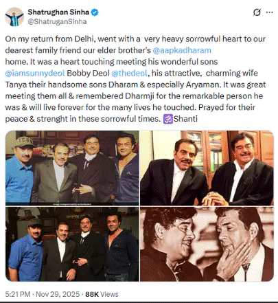 शत्रुघ्न ने अपने पोस्ट में लिखा, “हमारे सबसे प्रिय पारिवारिक मित्र से मुलाकात हुई। ड्रीमगर्ल हेमा हमारी सबसे प्यारी पारिवारिक मित्र, हमारे बड़े भाई को खोने के इस दुखद समय में उनसे मिलना हृदय विदारक था। धर्मेंद्र की दो खूबसूरत बेटियों ईशा देओल और अहाना देओल से उनके अपार दुख पर सांत्वना। धरमजी एक दयालु और सौम्य आत्मा थे। वह आज हमारे बीच नहीं हैं, लेकिन उनकी यादें हमेशा हमारे साथ रहेंगी। ओम शांति।”