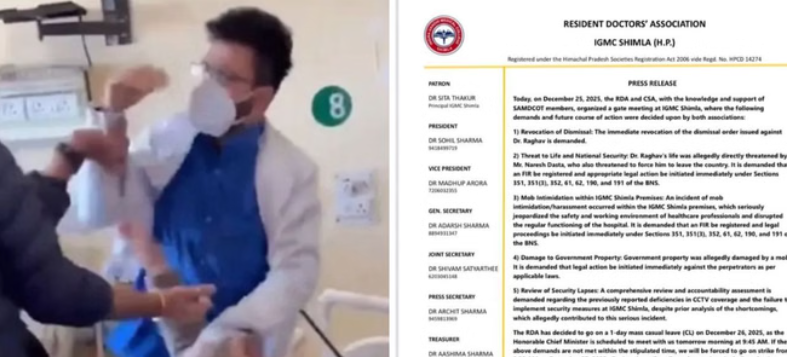 इसी बीच शिमला के तीन बड़े सरकारी अस्पतालों—आईजीएमसी, कमला नेहरू अस्पताल और डीडीयू—में आपातकालीन सेवाएं जारी रहेंगी, लेकिन ओपीडी प्रभावित होने और सर्जरी टलने की आशंका है। कई डॉक्टर पहले ही शीतकालीन अवकाश पर हैं, ऐसे में ओपीडी कंसल्टेंट डॉक्टरों के हवाले रहेगी।