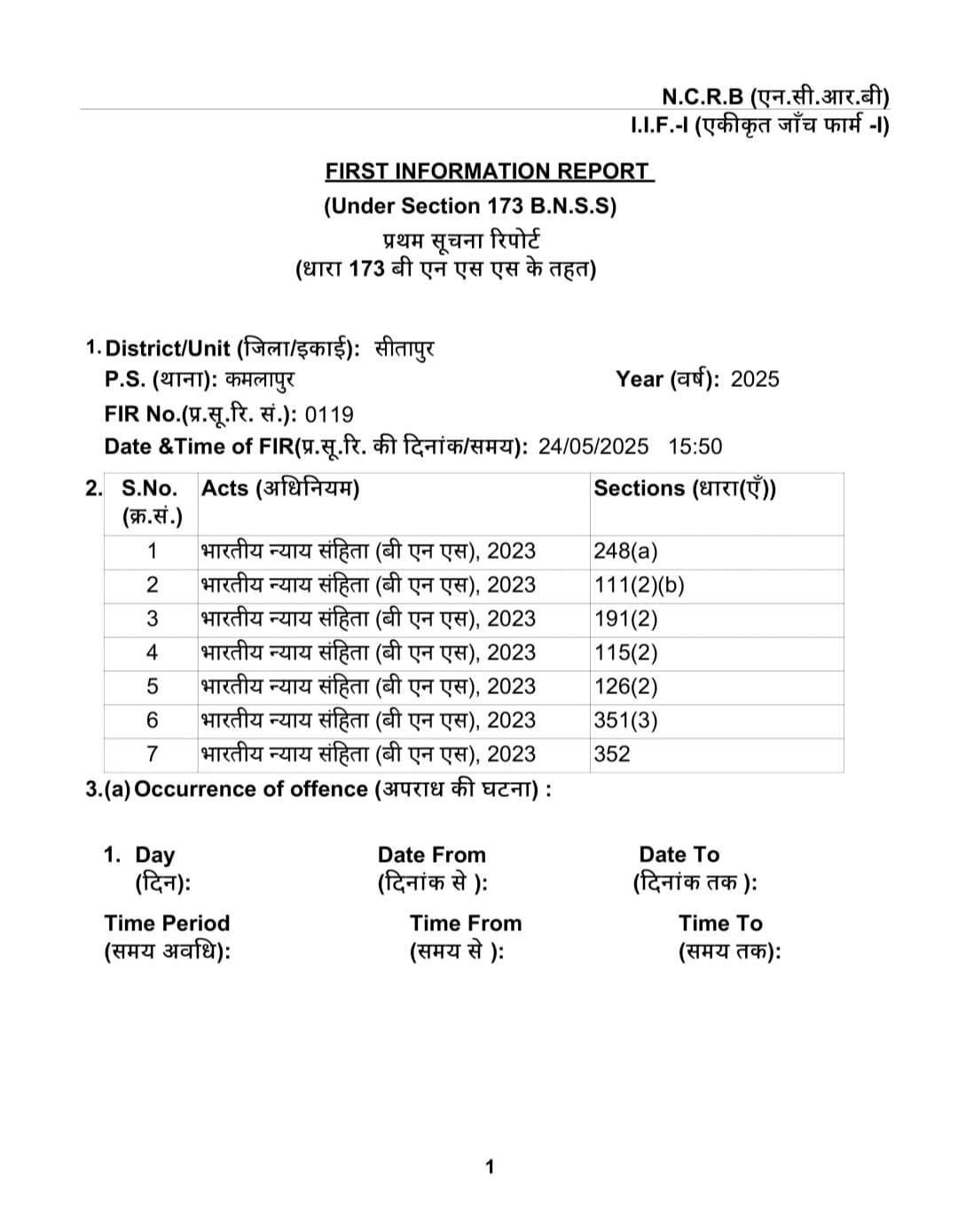 जिसके साथ 4 से 5 व्यक्ति और थे, जिन्हें मै नही जानता ये लोग मिले और मुझे धन का प्रलोभन देकर पहले तो उपरोक्त मैसेज को अपने चौनल पर चलाने का मेरे ऊपर दबाव बनवाया। जब मैने मना किया तो उन लोगों ने उसे पीटा। जिससे जान बचाने की खारित मैसेज चलाना पड़ा। मेरे द्वारा जब इनका मैसेज डिलीट किया गया तो इनके द्वारा मुझे 2 बार फोन किया गया, किन्तु मैने इनका फोन नही उठाया जिन नम्बरो से मेरे पास फोन आए व मैसेज आया उन्हे मै बाद में बताऊंगा। एक्त तहरीर के आधार पर पुलिस ने 248 ए, 111 दो बी, 191 दो, 115 दो, 126 दो, 351 तीन तथा 352 के तहत मुकदमा पंजीकृत किया है।