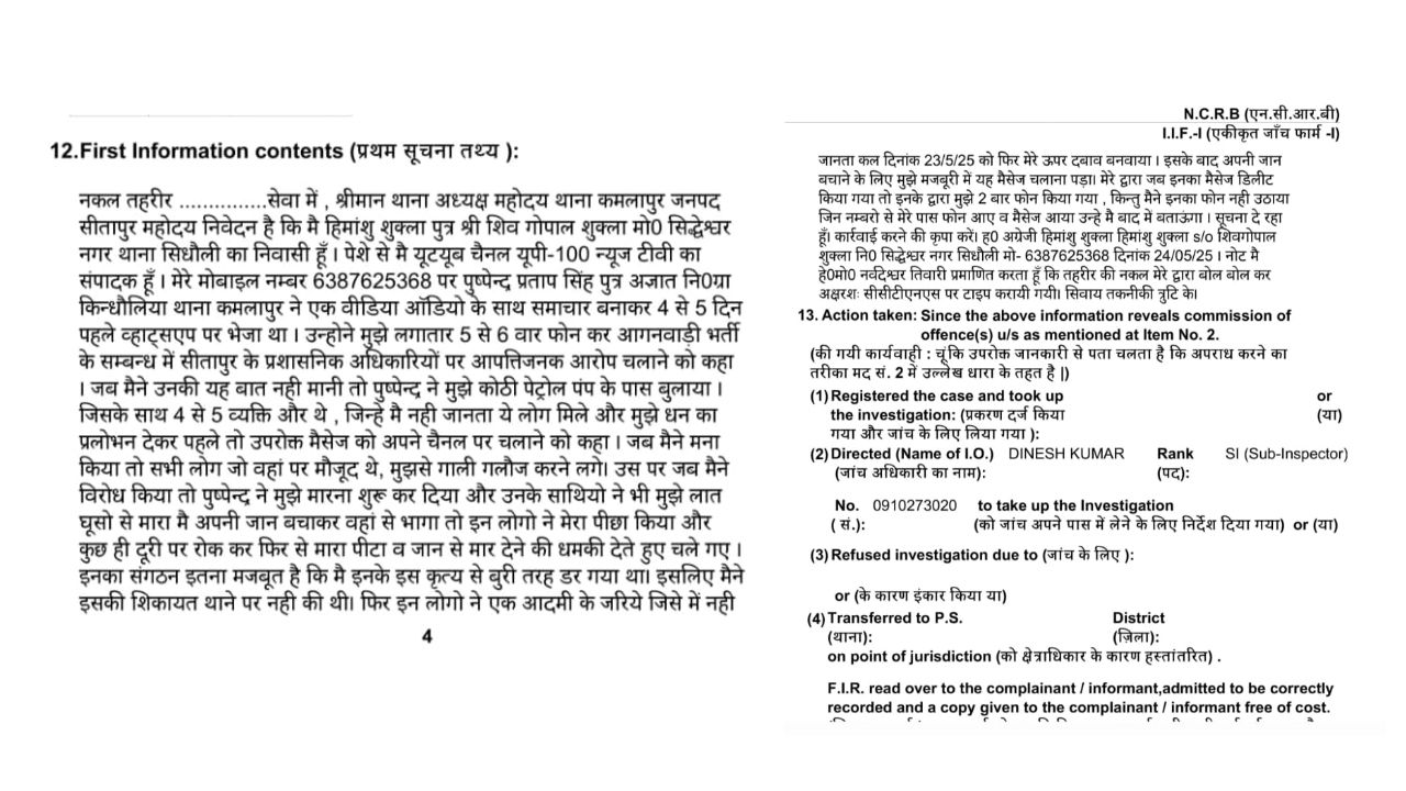 थाना सिधौली के मो० सिद्धेश्वर नगर के रहने वाले हिमांशु शुक्ला पुत्र शिव गोपाल शुक्ला ने थाना कमलापुर में तहरीर के आधार पर मुकदमा पंजीकृत कराया है कि वह पेशे से यूट्यूब चैनल टीवी का संपादक है। उसके मोबाइल पर पुष्पेन्द्र प्रताप सिंह पुत्र अज्ञात नि०ग्रा किन्धौलिया थाना कमलापुर ने एक वीडिया ऑडियो के साथ समाचार बनाकर 4 से 5 दिन पहले व्हाट्सएप पर भेजा था। उन्होने मुझे लगातार 5 से 6 बार फोन कर आंगनवाड़ी भर्ती के सम्बन्ध में सीतापुर के प्रशासनिक अधिकारियों पर आपत्तिजनक आरोप चलाने को कहा। जब मैने उनकी यह बात नही मानी तो पुष्पेन्द्र ने मुझे कोठी पेट्रोल पंप के पास बुलाया।