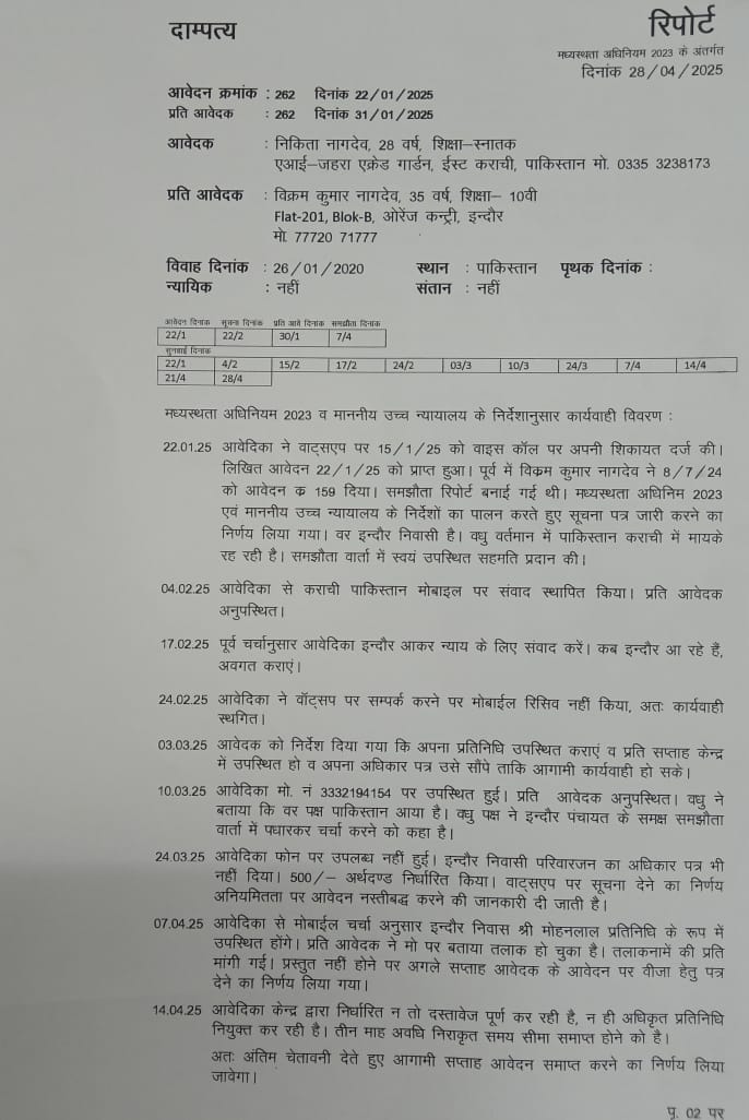 कराची निवासी निकिता ने इंदौर की सिंधी पंचायत को व्हाट्सएप पर एक भावुक संदेश भेजा, जिसमें उसने कहा कि उसका पति उसे छोड़कर अब भारत में दूसरी लड़की से सगाई कर चुका है। निकिता के अनुसार, दोनों की शादी 26 जनवरी 2020 को कराची में हिंदू रीति-रिवाज से हुई थी, और एक महीने बाद वह पति के साथ भारत आ गई थी। निकिता का वीज़ा शॉर्ट टर्म था, इसलिए 9 जुलाई 2020 को उसे अटारी बॉर्डर से वापस पाकिस्तान लौटना पड़ा।