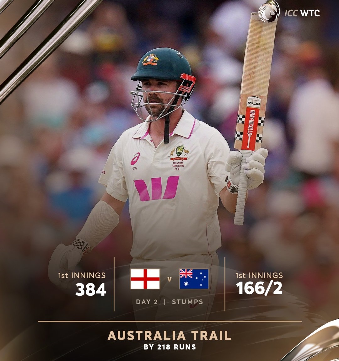जवाब में ऑस्ट्रेलिया ने मजबूत शुरुआत की है। दूसरे दिन का खेल समाप्त होने तक टीम ने 2 विकेट के नुकसान पर 166 रन बना लिए हैं। ट्रेविस हेड 87 गेंदों में नाबाद 91 रन बनाकर शानदार लय में नजर आ रहे हैं, जबकि नाइट वॉचमैन के रूप में उतरे माइकल नेसर 15 गेंदों में एक रन बनाकर नाबाद हैं। सलामी बल्लेबाज जेक वेदराल्ड 21 रन और मार्नस लाबुशेन 48 रन बनाकर आउट हुए।