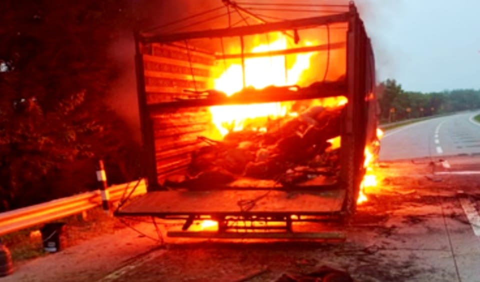 दो ट्रकों की भिड़ंत के बाद एक में लगी भीषण आग, जिंदा जला चालक