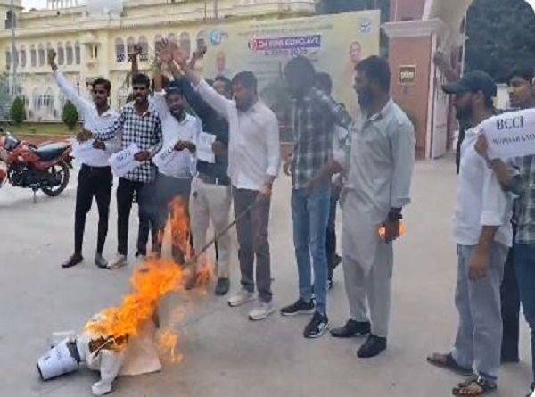 भारत-पाकिस्तान मैच के विरोध में छात्र संगठन ने लखनऊ में बीसीसीआई का पुतला फूंका