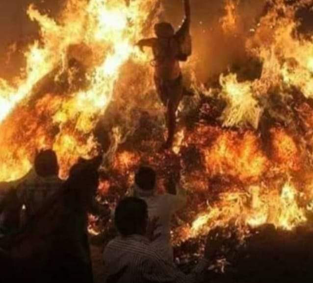 मथुरा में जलती होलिका में दौड़ने लगा पंडा, बोला – 30 फीट ऊँची आग भी छोटी दिखी