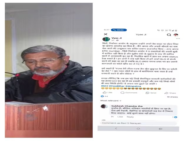 Bihar Voter List : बिहार के पूर्व वरिष्ठ आईएएस अधिकारी व्यास जी ने बिहार वोटर लिस्ट में अपने और अपनी पत्नी के नाम न होने पर गंभीर चिंता जताई है। उन्होंने सोशल मीडिया पर एक पोस्ट के माध्यम से निर्वाचन आयोग की कार्यप्रणाली पर सवाल उठाए हैं। व्यास जी ने बताया कि उन्होंने और उनकी … Read more