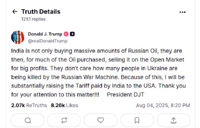 ट्रंप ने सोमवार रात अपने सोशल मीडिया प्लेटफॉर्म ‘ट्रुथ सोशल’ पर पोस्ट करते हुए कहा, “भारत न केवल बड़ी मात्रा में रूसी तेल खरीद रहा है, बल्कि उसका एक बड़ा हिस्सा खुले बाजार में भारी मुनाफे पर बेच रहा है। उन्हें परवाह नहीं है कि यूक्रेन में कितने लोग मारे जा रहे हैं।”