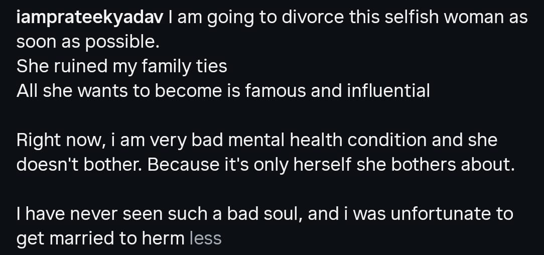 प्रतीक यादव ने अपने सोशल मीडिया अकाउंट इंस्टाग्राम (@iamprateekyadav) से एक पोस्ट करके यह जानकारी दी है। पोस्ट में उन्होंने लिखा, “मैं अपर्णा को जल्द से जल्द तलाक देने जा रहा हूं। उन्होंने मेरे परिवार के रिश्ते खराब कर दिए हैं। बस मशहूर और असरदार बनना चाहती हैं। अभी, मेरी मेंटल हेल्थ बहुत खराब है, लेकिन उन्हें कोई फर्क नहीं पड़ता। क्योंकि उन्हें सिर्फ़ अपनी ही चिंता है। मैं बदकिस्मत था कि मेरी शादी उनसे हुई।”