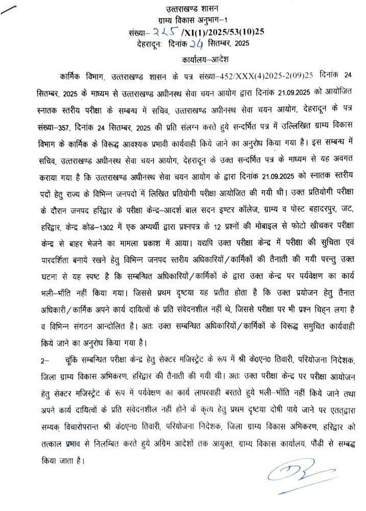 उत्तराखंड अधीनस्थ सेवा चयन आयोग की 21 सितंबर को हुई स्नातक स्तरीय परीक्षा के दौरान यह घटना सार्वजनिक हुई और युवाओं में आक्रोश फैल गया। निलंबन के साथ सरकार यह संदेश देना चाहती है कि परीक्षा व्यवस्था में लापरवाही बर्दाश्त नहीं की जाएगी।