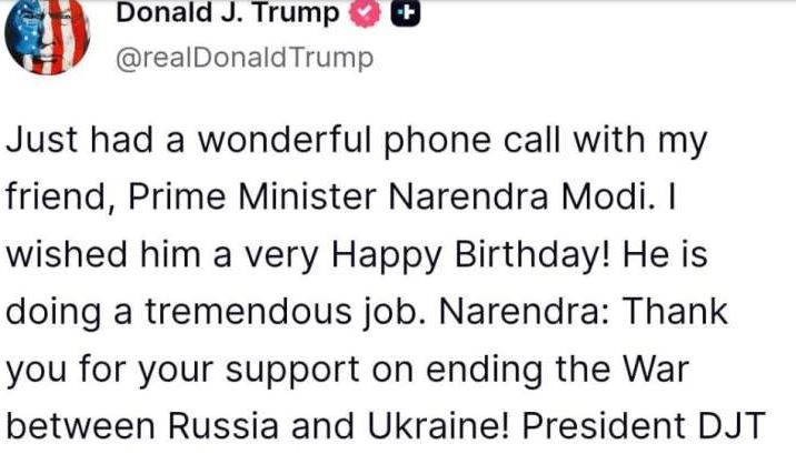 “मैंने अपने दोस्त प्रधानमंत्री नरेंद्र मोदी के साथ फोन पर अच्छी बातचीत की। उन्हें जन्मदिन की ढेरों शुभकामनाएं दीं। वह बेहतरीन काम कर रहे हैं। नरेंद्र, रूस-यूक्रेन युद्ध को खत्म करने में आपके समर्थन के लिए शुक्रिया!” – प्रेसिडेंट डीजेटी