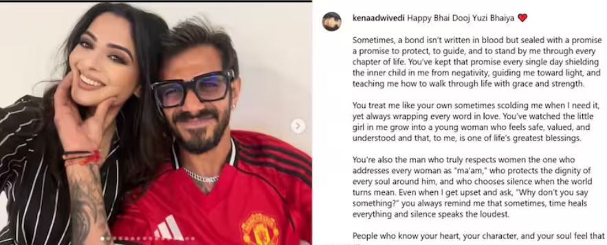 नई दिल्ली। भारतीय क्रिकेटर युजवेंद्र चहल और धनश्री वर्मा के तलाक को सात महीने बीत चुके हैं। शुरू में दोनों ने अपने रिश्ते को लेकर चुप्पी साधी थी, लेकिन अब सोशल मीडिया पर दोनों अक्सर अपने पोस्ट्स के ज़रिए एक-दूसरे पर परोक्ष तंज कसते दिखाई देते हैं। हाल ही में भाई दूज के मौके पर युजवेंद्र चहल की बहन केना द्विवेदी का एक पोस्ट सामने आया, जिसने एक बार फिर इस चर्चा को हवा दे दी है।